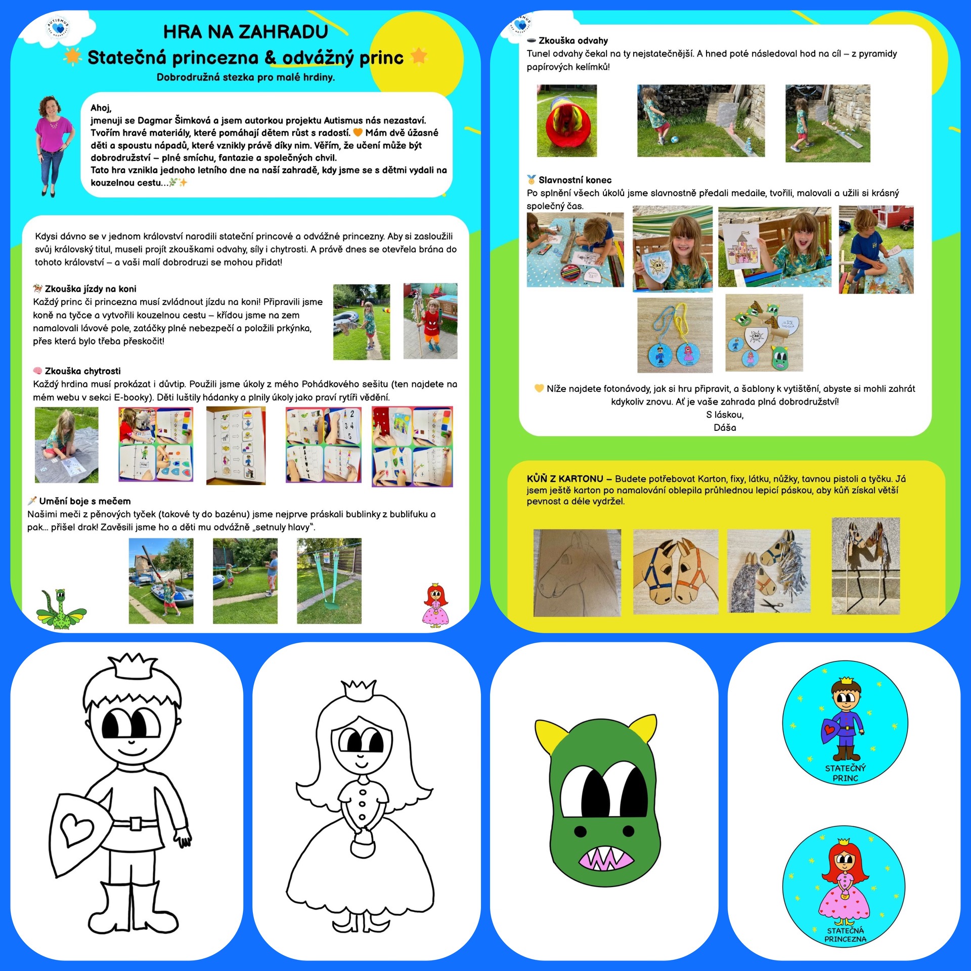 PDF ke stažení zdarma | 12 stran (3 přípravné, 9 herních) Zahrajte si s dětmi na pohádkové hrdiny! Tato venkovní hra je plná dobrodružství, pohybu a tvoření, při kterém si děti vyzkouší rytířské i princeznovské dovednosti – zkoušku jízdy na koni, umění boje s mečem, chytrost, odvahu i předávání medailí. Součástí PDF jsou i návody a šablony na výrobu medailí, erbů, koníčka i draka, díky kterým se celá hra promění v opravdový kouzelný zážitek.