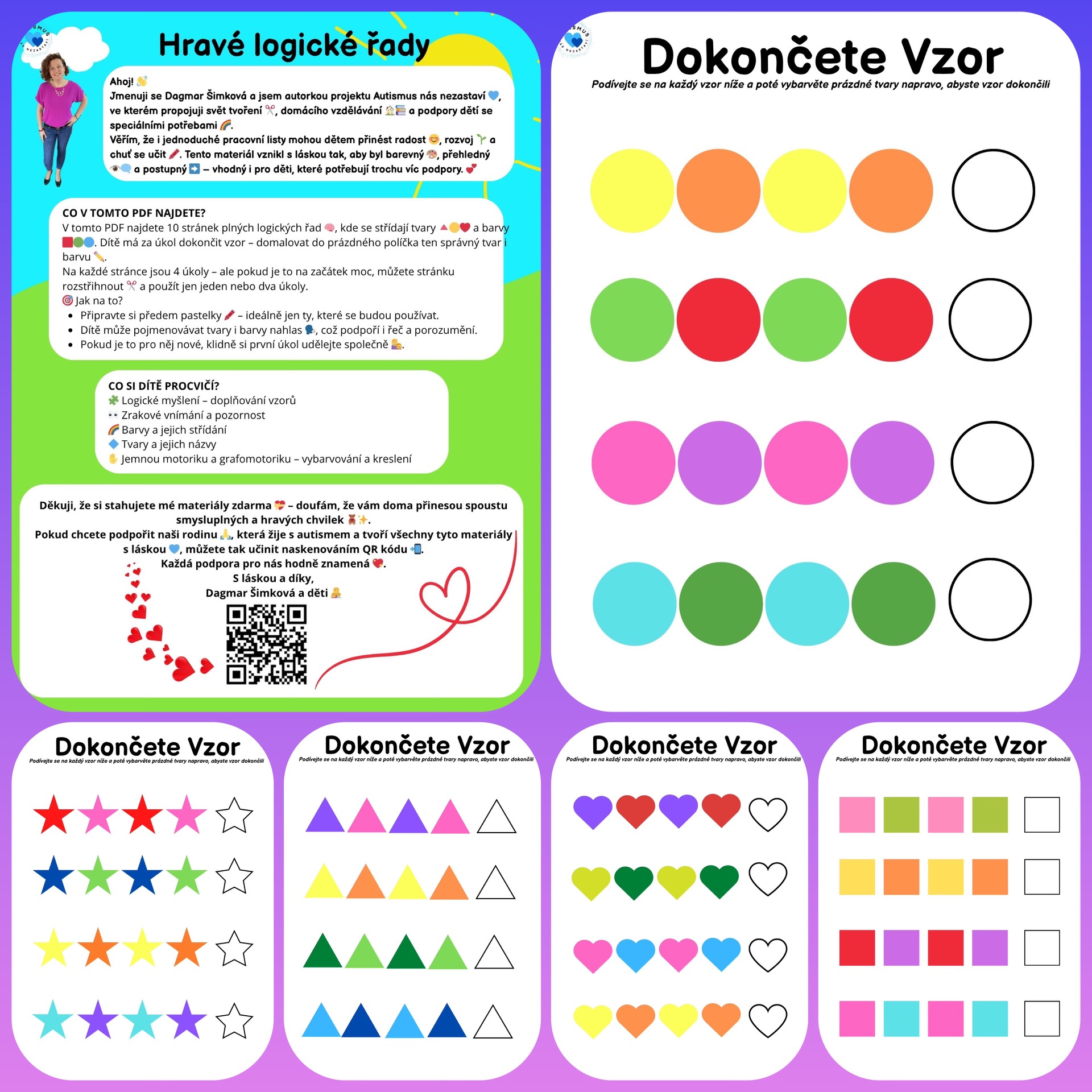 Tento soubor obsahuje 10 tisknutelných stran, kde si děti hravou formou procvičí logické myšlení, vnímání vzorů, poznávání tvarů a barev. Na každé stránce čekají 4 jednoduché řady, které je potřeba dokončit správnou barvou.