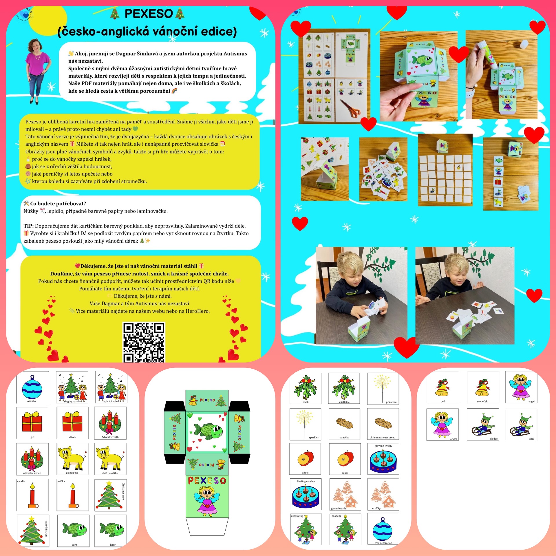 Součástí PDF je také návod s fotkami a šablona na výrobu krabičky, díky které si děti mohou celé pexeso samy vyrobit, ozdobit a uchovat. Pexeso je vhodné i jako malý dárek – ať už domů, do školky nebo do školy.