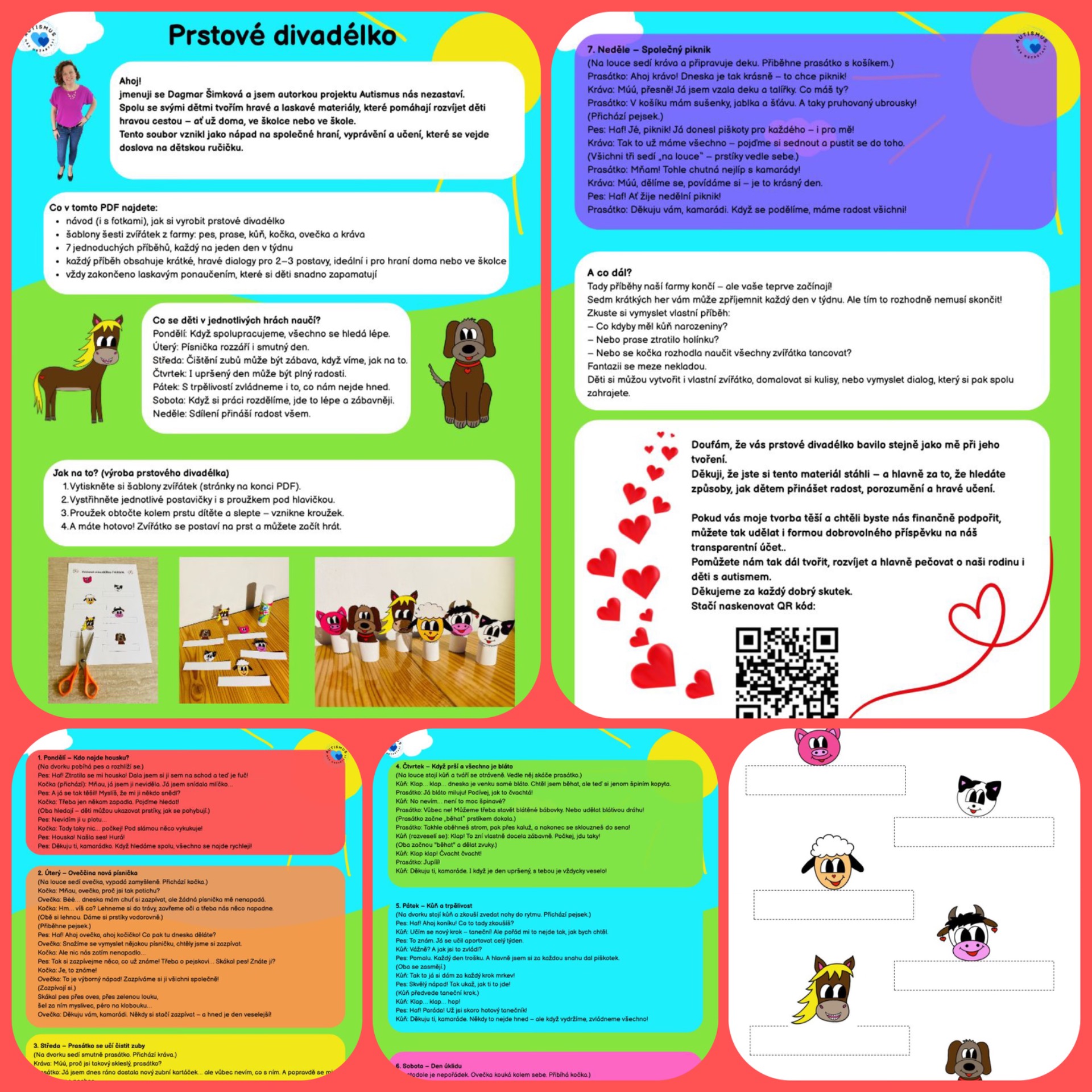 PDF ke stažení zdarma | 5 stran (1 tisková, 4 příběhové) Pohádkové hraní s prsty v hlavní roli! Tento tvořivý materiál přináší 6 zvířátek z farmy, která si děti vystřihnou, slepí na prst a promění se v malou hereckou partu. K tomu na vás čeká 7 krátkých příběhů – jeden na každý den v týdnu, plný zábavy, dobrodružství i drobných ponaučení. Hodí se pro rodiče, učitele i všechny, kdo si rádi hrají a tvoří. Díky prstovému divadélku FARMA zažijete se svými dětmi společné chvíle plné smíchu, fantazie a vyprávění.