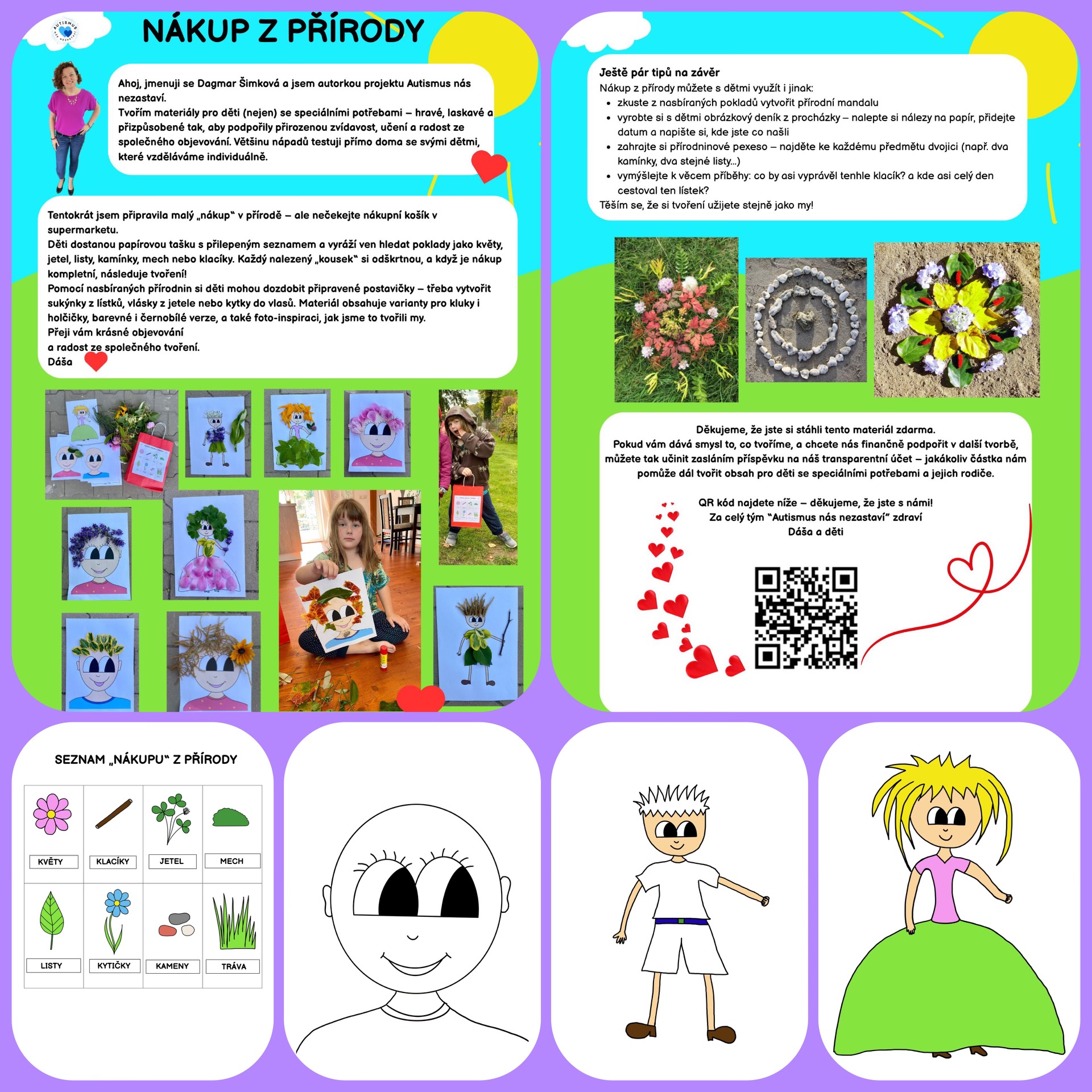 PDF ke stažení zdarma | 13 stran (2 úvodní, 11 k tisku) Proměňte procházku v dobrodružný nákupní výlet! Děti si sbírají květy, lístky, kamínky a další přírodní poklady do připravené tašky podle tematického seznamu. Po návratu je čeká tvoření – mohou z nasbíraných věcí vytvořit papírové postavičky, mandalu nebo si jen tak hrát a objevovat. Součástí materiálu jsou černobílé i barevné šablony, fotoinspirace a jednoduché tipy na další aktivity, které zapojí přírodu, fantazii i jemnou motoriku.